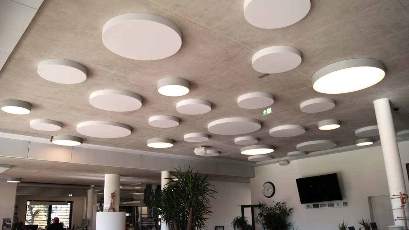 Täckplattor för bullerskydd ger lugn och ett behagligt inlärningsklimat även i de mest högljudda klassrummen. För att eftermontera ett akustiktak i skolan är det lämpligt att dra in ett vanligt undertak kombinerat med aixFOAM-akustikelement på grund av att rummen har högt i tak. En installation med hjälp av monteringshängkassetter som hängs upp med en vajerkonstruktion från rumstaket och kan placeras mycket nära ljudkällan är också tänkbar.