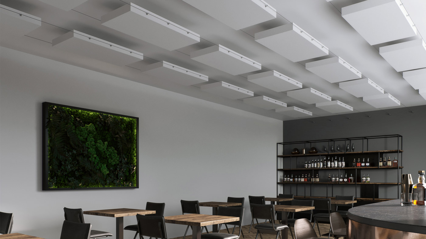 Färgglada ljudabsorbenter i hängkassetter anpassar sig till dagens rumsinredning, minskar bullret och ger en bättre rumsakustik på barer, snackbarer, caféer eller restauranger.